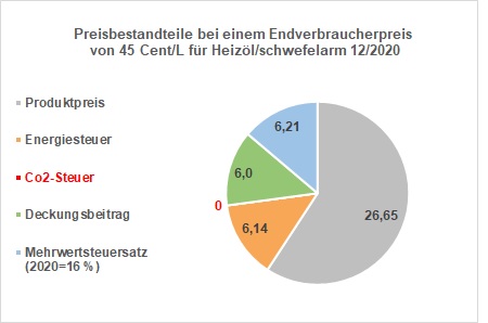 Gemäß unserem Preisbeispiel - mit einem Brutto-Heizölpreis von 45 Cent/Liter Heizöl - ergibt sich folgende Heizölpreistruktur bis zum 31.12.2020 (siehe Grafik bzw. Tabelle):